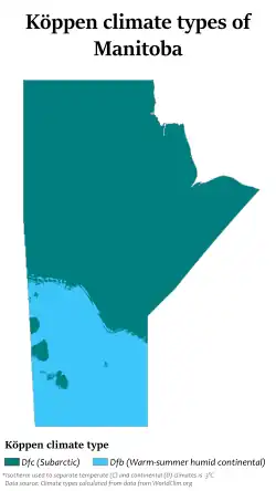 The province's northern sections (including the city of Thompson) fall in the subarctic climate zone (Köppen climate classification Dfc). This region features long and extremely cold winters and brief, warm summers with little precipitation.[13] Overnight temperatures as low as −40 °C (−40 °F) occur on several days each winter.[13]