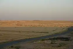 In contrast with the arid plateau of Mesopotamia stretched the rich alluvial plain of Chaldea, formed by the deposits of the two great rivers that encircled it. The soil was extremely fertile, and teemed with an industrious population. Eastward rose the mountains of Elam, southward were the sea-marshes and the Kaldy or Chaldeans and other Arameans, while on the west the civilization of Babylonia encroached beyond the banks of the Euphrates, upon the territory of the nomadic ancient Semitic-speaking peoples (or Suti). Here stood Ur (Mugheir, more correctly Muqayyar) the earliest capital of the country; and Babylon, with its suburb, Borsippa (Birs Nimrud), as well as the two Sippars (the Sepharvaim of Scripture, now Abu Habba), occupied both the Arabian and Chaldaean sides of the river. The Arakhtu, or "river of Babylon," flowed past the southern side of the city, and to the southwest of it on the Arabian bank lay the great inland freshwater sea of Najaf, surrounded by red sandstone cliffs of considerable height, 40 miles (64 km) in length and 35 in breadth in the widest part. Above and below this sea, from Borsippa to Kufa, extend the famous Chaldaean marshes, where Alexander the Great was nearly lost (Arrian, Eup. Al. vii. 22; Strabo xvi. I, § 12); but these depend upon the state of the Hindiya canal, disappearing altogether when it is closed.
