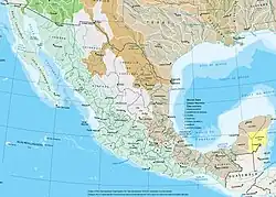 The geography of Mexico describes the geographic features of Mexico, a country in the Americas. Mexico is located at about 23° N and 102° W[1] in the southern portion of North America.[2][3] From its farthest land points, Mexico is a little over 3,200 km (2,000 mi) in length. Mexico is bounded to the north by the United States (specifically, from west to east, by California, Arizona, New Mexico, and Texas), to the west and south by the Pacific Ocean, to the east by the Gulf of Mexico, and to the southeast by Belize, Guatemala, and the Caribbean Sea. The northernmost constituent of Latin America, it is the most populous Spanish-speaking country in the world. Mexico is the world's 13th largest country, three times the size of Texas.[4]