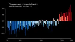 Temperature change in Mexico, each bar represents the average temperature over that yea