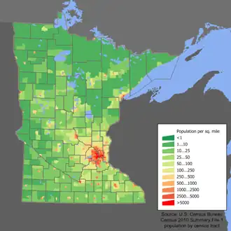 - Demographically, population density varies from less than 4 persons per square mile in the least developed areas to 8,000 persons per square mile in Minneapolis.