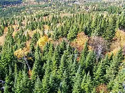 The forest area of Quebec is estimated at 750,300 km2 (289,700 sq mi).[68] From the Abitibi-Témiscamingue to the North Shore, the forest is composed primarily of conifers such as the balsam fir, the jack pine, the white spruce, the black spruce and the tamarack. Some species of deciduous trees such as the yellow birch appear when the river is approached in the south. The deciduous forest of the Great Lakes–St. Lawrence Lowlands is mostly composed of deciduous species such as the sugar maple, the red maple, the white ash, the American beech, the butternut (white walnut), the American elm, the basswood, the bitternut hickory and the northern red oak as well as some conifers such as the eastern white pine and the northern whitecedar. The distribution areas of the paper birch, the trembling aspen and the mountain ash cover more than half of Quebec territory.[69]