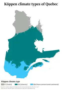 - ↑ Quebec Portal (October 12, 2006). "Zones climatiques du Québec". Government of Quebec. Archived from the original on August 6, 2011. Retrieved January 23, 2010.