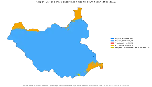 The geography of South Sudan describes the physical features of South Sudan, a country in East Africa. South Sudan is a landlocked country and borders – clockwise – Sudan from the north, Ethiopia from the east, Kenya, Uganda and the Democratic Republic of the Congo from the south and the Central African Republic from the west.