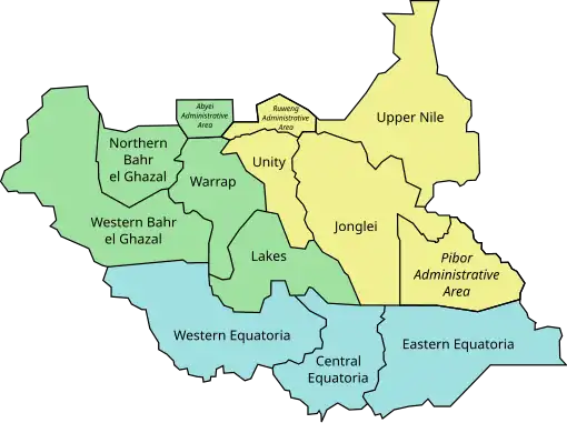 As of February 2020, South Sudan is divided into 10 states, two administrative areas, and one area with special administrative status. All together, they correspond to three historical regions of the Sudan: Bahr el Ghazal, Equatoria, and Greater Upper Nile.