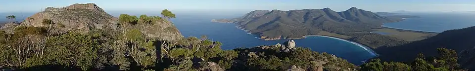 Tasmania features a high concentration of waterfalls. These can be found in small creeks, alpine streams, rapid rivers, or off precipitous plunges. Some of the tallest waterfalls are found on mountain massifs, sometimes at a 200-metre cascade. The most famous and most visited waterfall in Tasmania is Russell Falls in Mount Field due to its proximity to Hobart and stepped falls at a total height of 58 metres.[7] Tasmania also has a large number of beaches, the longest of which is Ocean Beach on the West Coast at about 40 kilometres.[8] Wineglass Bay in Freycinet on the east coast is a well-known landmark of the state.