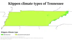 Most of the state has a humid subtropical climate, with the exception of some of the higher elevations in the Appalachians, which are classified as having a mountain temperate or humid continental climate due to cooler temperatures.[56] The Gulf of Mexico is the dominant factor in the climate of Tennessee, with winds from the south being responsible for most of the state's annual precipitation. Generally, the state has hot summers and mild to cool winters with generous precipitation throughout the year, with highest average monthly precipitation generally in the winter and spring months, between December and April. The driest months, on average, are August to October. On average the state receives 50 inches (130 cm) of precipitation annually. Snowfall ranges from 5 inches (13 cm) in West Tennessee to over 80 inches (200 cm) in the highest mountains in East Tennessee.[57][58]