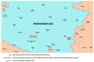 Detailed map of the south-eastern part of Pannonian Sea (modern territory of Vojvodina) during the Miocene Epoch.