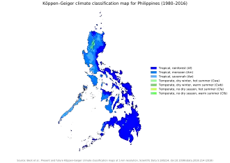 52. 1 2 "Climate of the Philippines". Philippine Atmospheric, Geophysical and Astronomical Services Administration. Archived from the original on April 18, 2018. Retrieved July 24, 2020. Based on the average of all weather stations in the Philippines, excluding Baguio, the mean annual temperature is 26.6o C. The coolest months fall in January with a mean temperature of 25.5oC while the warmest month occurs in May with a mean temperature of 28.3oC. Latitude is an insignificant factor in the variation of temperature while altitude shows greater contrast in temperature. Thus, the mean annual temperature of Baguio with an elevation of 1,500 meters is 18.3oC.