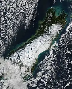 A true-colour image of the South Island, after a powerful winter storm swept across New Zealand on 12 June 2006