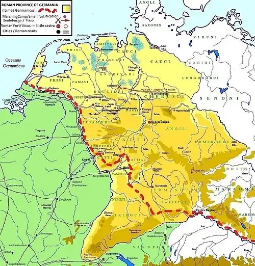 Map of the Roman province of Germania Antiqua (marked in yellow), from 7 BC to AD 9