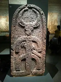 Excavations of et-Tell have revealed evidence of the Geshurite religious practices including high places, decorated stelae, offering vessels, sacrificial animals and dedicatory inscriptions.[17][16] This material culture reveals strong influences from neighbouring countries.[17] Their religious worship appears to have centered around worship of the moon-god in the form of a bull which was common in southern Syria, whilst an Egyptian influence can be seen in their art and amulets.[17] The bull stele from the city gate has alternatively been interpreted as either a symbol of the chief god Hadad, in charge of rainfall; the moon god, who brought about the swelling of the rivers; or a combination of the two.[18] The influence of the Israelite religion to the south may be seen in dietary practices and the selection of sacrificial animals.[17]