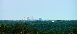 Gildersleeve Mountain also has views of Lake Erie from locations near the summit. From one location the view to the west and southwest affords a view of the downtown Cleveland skyline, 18 miles (29 km) away. On clear days the stacks in Lorain or Avon Lake may be visible, and on exceptional days the plume from cooling towers at the Davis-Besse, or Permian, nuclear power stations may be visible far to the west.