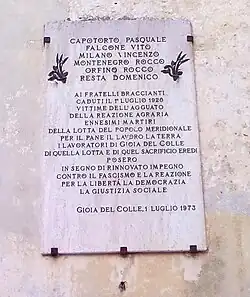 - ↑ Berloco, Roberto (16 November 2013). "PERLE DI STORIA PUGLIESE / Gioia del Colle, origini bizantine per una storia di tutto rispetto (3° puntata)". Giornale di Puglia. Archived from the original on 22 June 2017.