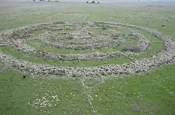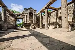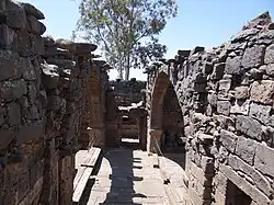 The political and economic recovery of Palestine during the reigns of Diocletian and Constantine, in the late 3rd and early 4th centuries AD, led to a resurgence of Jewish life in the Golan. Excavations at various synagogue sites have uncovered ceramics and coins that provide evidence of this resettlement.[56] During this period, several synagogues were constructed, and today 25 locations with ancient synagogues or their remnants have been discovered, all situated in the central Golan. These synagogues, built from the abundant basalt stones of the region, were influenced by those in the Galilee but exhibited their own distinctive characteristics; prominent examples include Umm el-Qanatir, Qatzrin and Deir Aziz.[56] Some of the early Jerusalem Talmud tractates may have been arranged and edited during this period in Qatzrin.[57][28] Several sites in the Golan show evidence of destruction from the Jewish revolt against Gallus in 351 CE. However, some of these sites were later rebuilt and continued to be inhabited in subsequent centuries.[28]