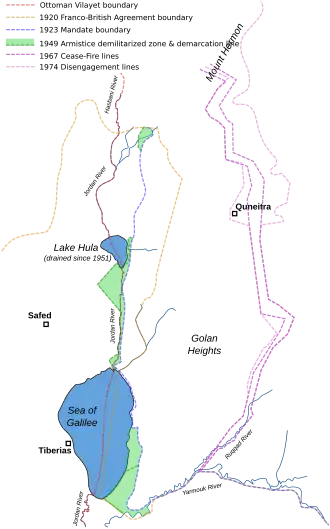 The Golan Heights, including the spring at Wazzani and the one at Banias, became part of French Syria, while the Sea of Galilee was placed entirely within British Mandatory Palestine. When the French Mandate for Syria ended in 1944, the Golan Heights became part of the newly independent state of Syria and was later incorporated into Quneitra Governorate.