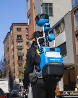 Google Maps Street View Trekker backpack being implemented on the sidewalk of the Hudson River Greenway in New York City