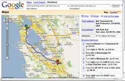 Google Maps provides a route planner,[57] allowing users to find available directions through driving, public transportation, walking, or biking.[58] Google has partnered globally with over 800 public transportation providers to adopt GTFS (General Transit Feed Specification), making the data available to third parties.[59][60] The app can indicate users' transit route, thanks to an October 2019 update. The incognito mode, eyes-free walking navigation features were released earlier.[61] A July 2020 update provided bike share routes.[62]