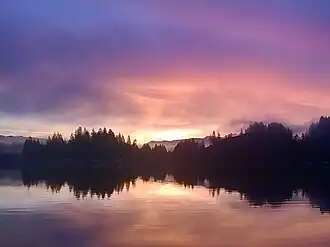 Great Central Lake is an oligotrophic lake on Vancouver Island. Located north of Sproat Lake and to the northwest of the city of Port Alberni, it is 45 kilometres (28 mi) long, with an area of 50.85 square kilometres (19.63 sq mi) and mean depth of 124 metres (407 ft), to a maximum of 250 metres (820 ft), making it the second deepest lake on Vancouver Island.[2] The lake is long and narrow, with the exception of Trestle Bay located on the east end of the lake. It is nestled beneath low mountains, with second-growth forest surrounding most of the lake. The relatively steep shoreline has kept Great Central Lake mostly undeveloped, but there are approximately 70 residents that live in float houses along the shoreline. The water level is controlled by a dam on the east side.
