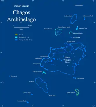 - ↑ British Admiralty nautical chart 11000030 - 3 Chagos Archipelago, Scale 1:360 000