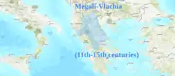 Great Vlachia or Great Wallachia (Aromanian: Vlãhia Mari; Greek: Μεγάλη Βλαχία, romanized: Megálē Vlachía), also simply known as Vlachia (Aromanian: Vlãhia; Greek: Βλαχία, romanized: Vlachía), was a province and region in southeastern Thessaly in the late 12th century, and was used to denote the entire region of Thessaly in the 13th and 14th centuries. The name derives from the Vlachs (Aromanians), who had lived across much of the area.