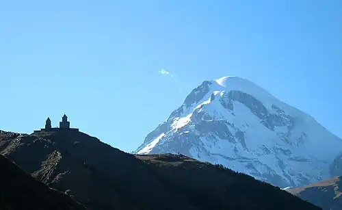 14th-century Georgian Orthodox Gergeti Trinity Church building, with Mount Kazbek in the background