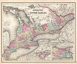 In 1840, the area became part of the new District of Wellington, and its territory formed the County of Waterloo for electoral purposes.[4][5] In 1849, Wellington District was abolished, and Waterloo County remained for municipal and judicial purposes.[6] The territory of the Bruce Peninsula became part of Waterloo in 1849,[7] but was later withdrawn and transferred to Bruce County in 1851.[8]