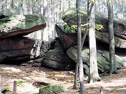 The granite rock outcrop known as Gypsy Rocks (Zigeunerfelsen), a fine example of spheroidal weathering, lies on the western slopes of the Kornberg, on the northern path (Nordweg) from Kirchenlamitz-Ost station to the summit. The largest block is about nine metres long, four to seven metres wide and two metres high; it weighs about 250 tonnes. A rock with the name Wackelstein is a rocking stone and can be made to rock with a wooden beam. The area is believed to have offered hordes of gypsies a refuge in times gone by. During the Thirty Years' War the inhabitants of the area took shelter here.