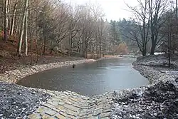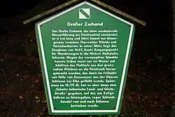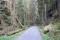An educational path, the Flößersteig ("Rafting Trail") begins at the Neumann Mill, running parallel to the Kirnitzsch river to Bad Schandau. In the northern part of the Großer Zschand, under a rock overhang, is a cave, closed with an iron door that acted as an explosive chamber until the end of the Second World War in order to block the valley at this point.[2]