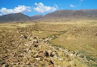 A dry gulch in the desert near Tamchy, Kyrgyzstan. The creek that may have run along the bottom of the gulch in the past has been diverted to a parallel aryk.