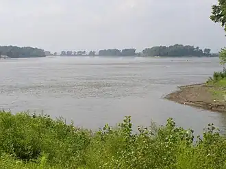 The small proportion of total water volume supplied from the great Missouri River basin is due to the light precipitation in that region. The lower Mississippi has no large tributaries from the lower east, but two important ones come from the west. The Mississippi Arkansas drainage area being a little less than the Ohio River and the basin of the Red River of Louisiana being about half as large. The Mississippi River drains an area of about one-third of the United States. The head of the coastal plain embayment is near the junction of the Ohio and the Mississippi. It flows southward for 560 miles (900 km) through the semi-consolidated strata of the plain. The river has eroded a valley about 40 to 50 miles (64 to 80 km) wide enclosed by bluffs one or two hundred feet high in the northern part. These bluffs decrease towards the south, but with local increase of height associated with a decrease in flood plain breadth on the eastern side where the Grand Gulf escarpment is traversed.