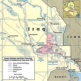 Massive drainage projects were started in the 1990s. Canals and embankments were built that split the once contiguous wetland into two, the West and East Hammar Marshes. An additional barrier between the two parts is the Rumaila oil field.[1] By 2000, less than 15% of the Hammar Marshes remained. Following the 2003 U.S. invasion of Iraq, returning Marsh Arabs broke embankments and drainage works, so that the wetland started to reflood. By the following year, vegetation had regrown significantly in the western part of the Hammar Marshes, and wildlife species returned. Recovery of the marshland habitat has been greater than expected, though there are still long-term risks to the habitat's viability due to pollution and water extraction from the Euphrates.[2] The salinity level of the re-flooded wetlands is higher than in typical freshwater wetlands.[3]