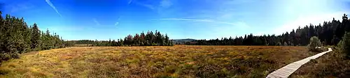 The raised bogs in the Harz are some of the best preserved in central Europe. They were formed at the end of the last ice age about 10,000 years ago. A significant proportion of the vegetation on these raised bogs is made up of peat mosses (Sphagnum spec.). The flarks (Schlenken) and the hummocks (Bulten) are home to different species of flora. In the flarks, for example, Sphagnum cuspidatum is found, whereas the hummocks are preferred by Sphagnum magellanicum. The blanket of peat moss is penetrated by dwarf bushes such as cowberry and blueberry. Bog-rosemary (Andromeda polifolia) is a relict of the ice age. Other such ice age plants include the dwarf birch (Betula nana) and few-flowered sedge (Carex pauciflora). Cranberries (Vaccinium oxicoccus) bloom from May to June. The black crowberry (Empetrum nigrum) may also be seen amongst those bearing black fruit. Common heather (Calluna vulgaris) grows on the drier hummocks and occasionally the cross-leaved heath (Erica tetralix) may be found. Typical grasses are the sheathed cottongrass (Eriophorum vaginatum), known for its bright, white clusters of fruit and deergrass (Scirpus cespitosus), which is rust-red in the autumn. One fascinating moorland plant is the round-leaved sundew (Drosera rotundifolia). Bog or northern bilberry (Vaccinium uliginosum) grows on the drier margins of the bog.