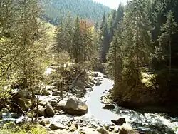 The waterways, with their distinct mountain stream character, play an important role right across the Harz. In comparison with the other natural regions of Lower Saxony, they are still very natural and varied, and the water is very clean. As a result of the high water velocity of the Harz streams, flowers rarely gain a foothold in the water. Even the animals in these streams need to be well suited to high velocities. Only a few species, such as fish, swim actively against the stream. The most common species are brown trout (Salmon trutta forma fario) and bullhead (Cottus gobio). Much richer in variety, by contrast, is the range of species in the system of crevices under the streambed. In addition to the insects and fish hatchlings that thrive here, may be found protozoons, flatworms (Turbellaria) and water mites (Hygrobatoidea). Other species of animals cling fast to the stones, e. g. caddis fly larvae (Trichoptera) and snails, or can only live in the reduced water velocities on the bed of the stream or on stones by having flat body shapes, e. g. stonefly larvae. In the calmer parts of the stream, behind stones or in blankets of moss, there are also water beetles (Hydrophilidae) and small shrimp-like amphipods.