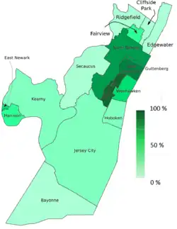 During the latter half of the 20th century, Cuban émigrés and exiles left their country and relocated to Union City, West New York, and surrounding communities in search of economic opportunity and political freedom.[2] Although the area during this period became significantly influenced by Cuban culture, over the course of the decades that followed, many Cubans spread into adjacent towns and many other Hispanic groups also moved into the area, resulting in a widespread and diverse Latino culture, commerce and identity that is non-exclusive of any people of Hispanic descent,[3][4][5][6][7] though Cubans remain a powerful voting bloc.[1][8] Numerous towns on the Hudson Palisades in northern Hudson and southeast Bergen counties have populations where more than 50% of the residents are foreign-born,[9] often with a Hispanic majority.[10] Some of its towns are among the most densely populated in the U.S.[11][12]—three of which (Guttenberg, Union City, and West New York) are the top three most densely populated municipalities in New Jersey.[13]