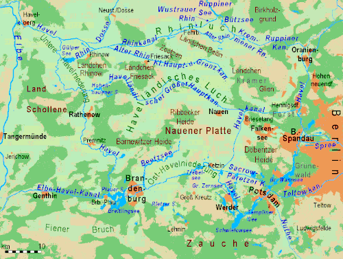 Geographically, the Havelland (German pronunciation: [ˈhaːfl̩ˌlant] ⓘ) is the region around which the River Havel flows in a U-shape between Oranienburg to the northeast and Rhinow to the northwest. The northern boundary of the Havelland is formed by the River Rhin and the Rhin Canal. In the history of Brandenburg, the Havelland represents a historic region.