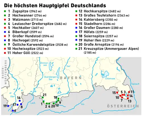 | 1 | Zugspitze | 2,962 (9,718) | Wetterstein | DE/AT | 24.6 (15.3) Acherkogel |