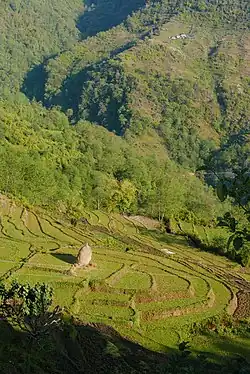 People have both adapted to mountain conditions and modified those conditions.[6] For example, farmers in many areas use terracing to retain soil and water.[4] Contour ploughing also helps stabilize the fragile soil.[7] Often human activity has degraded the mountain environments.[3] Humans have reduced biodiversity in many of the world's mountain regions.[8] Areas with high biodiversity where the environment is under intense stress include California's montane ecoregions (California montane chaparral and woodlands), the mixed forest ecoregion in the Caucasus, and in northwest South America the Magdalena Valley montane forests, Magdalena–Urabá moist forests and Western Ecuador moist forests.[3]