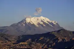 Illimani (Aymara and Spanish pronunciation: [iʎiˈmani]) is the highest mountain in the Cordillera Real (part of the Cordillera Oriental, a subrange of the Andes) of western Bolivia. It lies near the cities of El Alto and La Paz at the eastern edge of the Altiplano. It is the second highest peak in Bolivia, after Nevado Sajama, and the eighteenth highest peak in South America.[3] The snow line lies at about 4,570 metres (15,000 ft) above sea level, and glaciers are found on the northern face at 4,982 m (16,350 ft). The mountain has four main peaks; the highest is the south summit, Nevado Illimani, which is a popular ascent for mountain climbers.