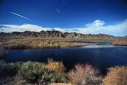 The Imperial National Wildlife Refuge protects wildlife habitat along 30 miles (50 km) of the lower Colorado River in Arizona and California, including the last un-channeled section before the river enters Mexico. The river and its associated backwater lakes and wetlands are a green oasis, contrasting with the surrounding desert mountains. It is a refuge and breeding area for migratory birds and local desert wildlife.[17]