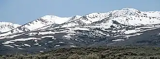 The Independence Mountains are a mountain range in northern Elko County, Nevada, United States. They are called Settoya in Shoshoni.[3] The range reaches a maximum elevation of 10,439 ft (3,182 m) on the summit of McAfee Peak. The range extends northward approximately 70 mi (110 km) from a point near Carlin to the banks of the Owyhee River. To the east is the North Fork of the Humboldt River, and to the west is the Owyhee Desert. Passing to the south is the main branch of the Humboldt River, and near the northern end of the range is the Wild Horse State Recreation Area. The Owyhee River is a tributary to the Snake-Columbia system, while the Humboldt is within the Great Basin.
