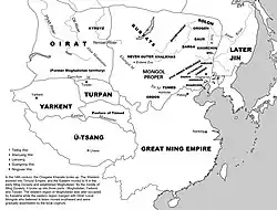 The eastern Mongol tribes near and in Manchuria, particularly the Khorchin and Southern Khalkha in today's Inner Mongolia intermarried, formed alliances with, and fought against the Jurchen tribes until Nurhaci, the founder of the new Jin dynasty, consolidated his control over all groups in the area in 1593.[14] The Manchus gained far-reaching control of the Inner Mongolian tribes in 1635, when Ligden Khan's son surrendered the Chakhar Mongol tribes to the Manchus. The Manchus subsequently invaded Ming China in 1644, bringing it under the control of their newly established Qing dynasty. Under the Qing dynasty (1644–1912), the Mongolian Plateau was administered in a different way for each region: