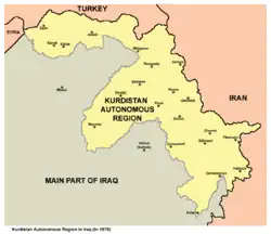 Iraqi Kurdistan or Southern Kurdistan[1] (Kurdish: باشووری کوردستان, romanized: Başûrê Kurdistanê)[2][3][4] refers to the Kurdish-populated part of northern Iraq. It is considered one of the four parts of Greater Kurdistan in West Asia, which also includes parts of southeastern Turkey (Northern Kurdistan), northern Syria (Western Kurdistan), and northwestern Iran (Eastern Kurdistan).[5][6] Much of the geographical and cultural region of Iraqi Kurdistan is part of the Kurdistan Region (KRI), a semi-autonomous region[7] recognized by the Constitution of Iraq.[8] As with the rest of Kurdistan, and unlike most of the rest of Iraq, the region is inland and mountainous.[9]