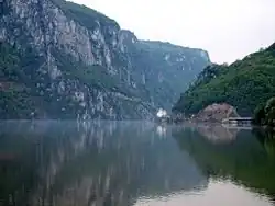 The Iron Gates (Bulgarian: Железни врата; Romanian: Porțile de Fier; Serbian: Ђердапска клисура / Đerdapska klisura or Гвоздена капија / Gvozdena kapija; Hungarian: Vaskapu-szoros) is a gorge on the river Danube. It forms part of the boundary between Serbia (to the south) and Romania (north). In the broad sense it encompasses a route of 134 km (83 mi); in the narrow sense it only encompasses the last barrier on this route, just beyond the Romanian city of Orșova, that contains two hydroelectric dams, with two power stations, Iron Gate I Hydroelectric Power Station and Iron Gate II Hydroelectric Power Station.