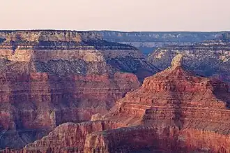 Isis Temple is a prominence in the Grand Canyon, Arizona, Southwestern United States. It is located below the North Rim and adjacent to the Granite Gorge along the Colorado River. The Trinity Creek and canyon flow due south at its west border; its north, and northeast border/flank is formed by Phantom Creek (Phantom Ranch, about 2,460 ft (750 m)) and canyon, a west tributary of Bright Angel Creek; the creeks intersect about 3 mi (4.8 km) southeast, and 1.0 mi (1.6 km) north of Granite Gorge.[4] The Isis Temple prominence (a short remainder caprock of bright-white Coconino Sandstone, on an erosion slope of brownish Hermit Formation), is only about 202 ft (62 m) lower than Grand Canyon Village, the main public center on Grand Canyon’s South Rim.