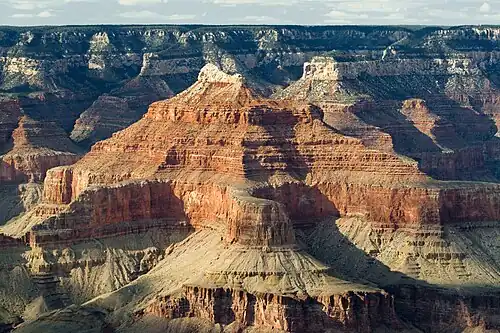 | Rock type(s) | sedimentary, upon Unkar Group quartzite and sedimentary Coconino Sandstone-(prominence), Hermit Shale, Supai Group, Redwall Limestone, Muav Limestone Temple Butte Formation Tonto Group–(units 2,v3 of 3) 3_Muav Limestone, 2_Bright Angel Shale, Unkar Group-(units 1,2,3 of 5) 3_Shinumo Quartzite, 2_Hakatai Shale, 1_Bass Limestone, Vishnu Basement Rocks |