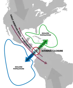 Over time, massive amounts of sediment from North and South America filled the gaps between the newly forming islands. Over millions of years, the sediment deposits added to the islands until the gap was completely filled. However, an article in Science magazine stated that zircon crystals in middle Miocene bedrock from northern Colombia indicated that by 10 Ma, it is likely that instead of islands, a full isthmus between the North and South American continents had already formed where the Central American Seaway had been previously.[18] A genomic study of army ants also suggests that the isthmus emerged millions of years earlier than had long been thought.[19] The Isthmus of Panama is not the only part of central America that has been low lying in the last tens of millions of years. This means the dates of first closure and final closure of the Central American Seaway (before it was artificially reopened to a degree by the Panama Canal) are likely to remain controversial. Some experts have proposed 15 Ma as the date of first closure,[20] while others suggest that final closure might be more recent, based on genetic drift data for black mangroves along the Atlantic and Pacific coasts.[21]