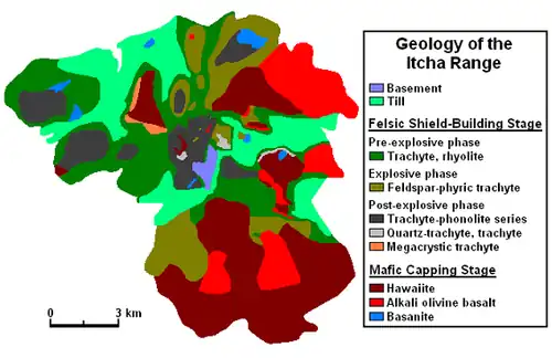 The Itcha Range is the smallest shield volcano in the Anahim Volcanic Belt in terms of area covered. Unlike the Rainbow and Ilgachuz ranges, the Itcha Range is composed of small coalescing volcanic units rather than a stratiform volcanic pile. It is, in many respects, similar to the small alkaline shields found in Kenya and Ethiopia along the East African Rift. About 60% of the shield is exposed whereas roughly 40% of it remains buried under glacial drift deposits. This suggests that the Itcha Range was glaciated repeatedly during the Pleistocene epoch. Glacial striae on polished surfaces of some of the oldest volcanic rocks in the eastern part of the shield and the local presence of drift deposits throughout the stratigraphy indicate that glaciation and volcanism were contemporaneous through much of the volcanic history of the Itcha Range.[3]