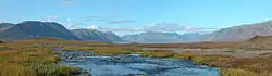The central part of the district is part of the Chukotka Mountains. The northwest is drained by the Amguema River. This valley is a key resource for the part of the population that does not live by the sea and contains the only significant stretch of road in the district, running from Egvekinot, through the indigenous locality of Amguema, to the now defunct mining settlement of Iultin.[13] Other populated places in the district are only reachable either by sea or by helicopter. The main lakes in the district are Ekityki, Ervynaygytgyn and Yanranaygytgyn.[14]
