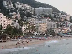 In 1987, four beaches in Jalisco were designated as federal marine turtle sanctuaries: El Tecuán, Cuitzmala, Teopa and Playón de Mismaloya, with an extension of 8 km (5.0 mi).[37] Playa Majahuitas is 27 km (17 mi) southwest of Puerto Vallarta with a rugged coastline, numerous inlets and outcroppings. The Cañon Submarino underwater canyon is located offshore. Chamela Bay has the greatest number of islets in Mexico, many of which are inhabited by numerous bird species.[38]